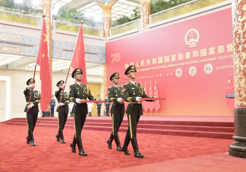 2019年9月29日,礼兵护送“共和国勋章”“友谊勋章”和国家荣誉称号奖章入场。当日上午10时,中华人民共和国国家勋章和国家荣誉称号颁授仪式在北京人民大会堂隆重举行。新华社记者丁海涛 摄